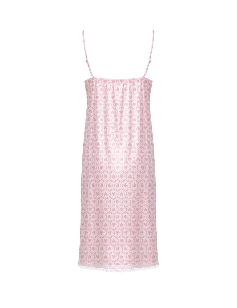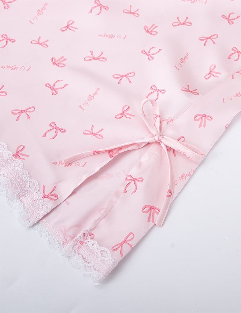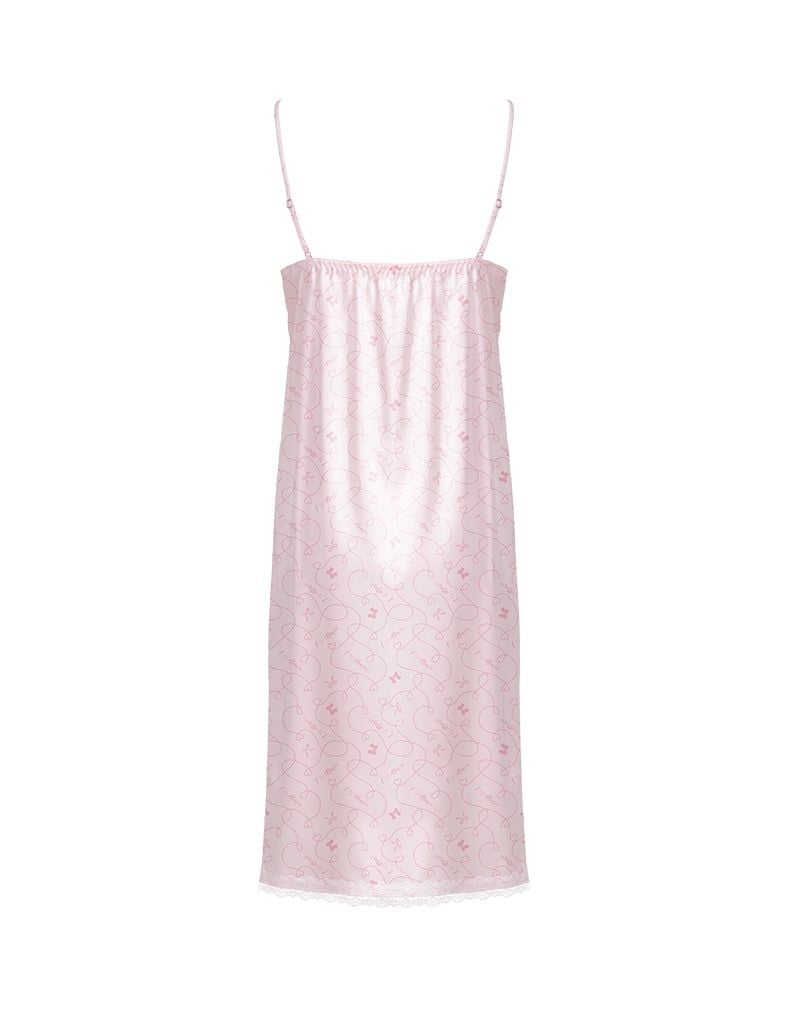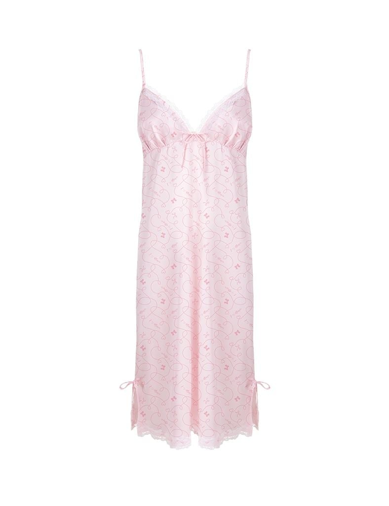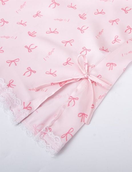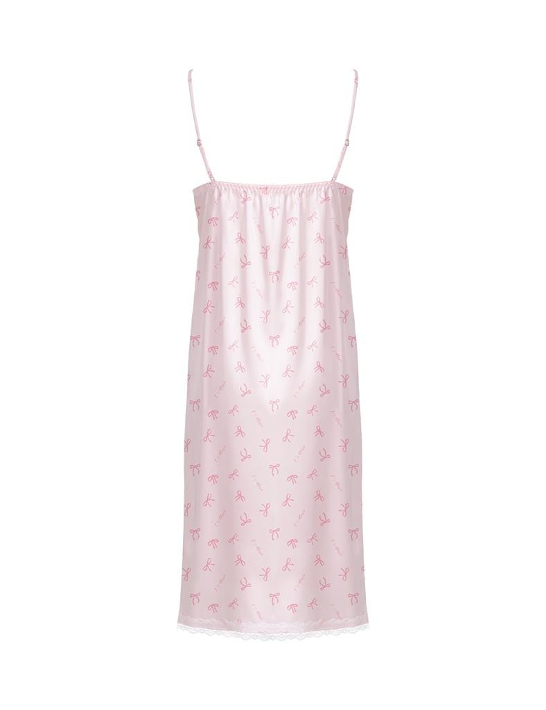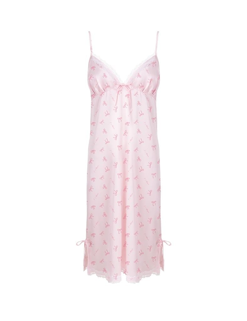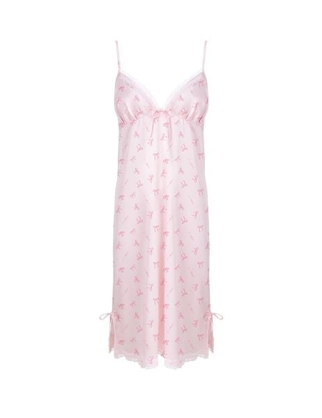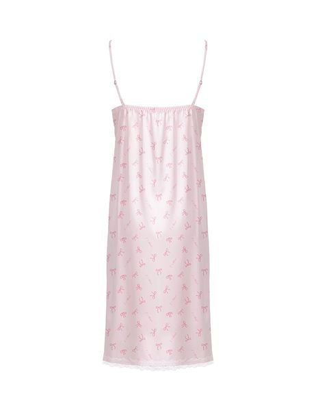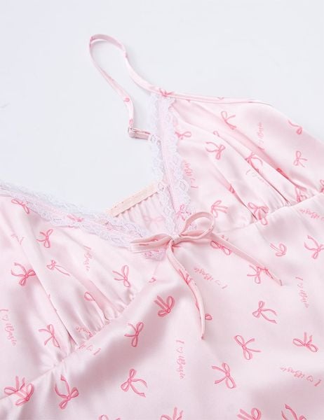 Đầm ngủ cổ V phối ren trắng tinh xảo, đính nơ nhỏ xinh ở ngực tạo điểm nhấn nhẹ nhàng.