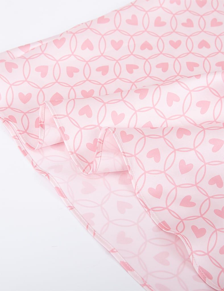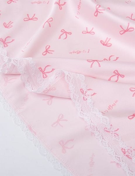 Họa tiết nơ, trái tim trên nền vải hồng tạo nên sự ngọt ngào nhẹ nhàng